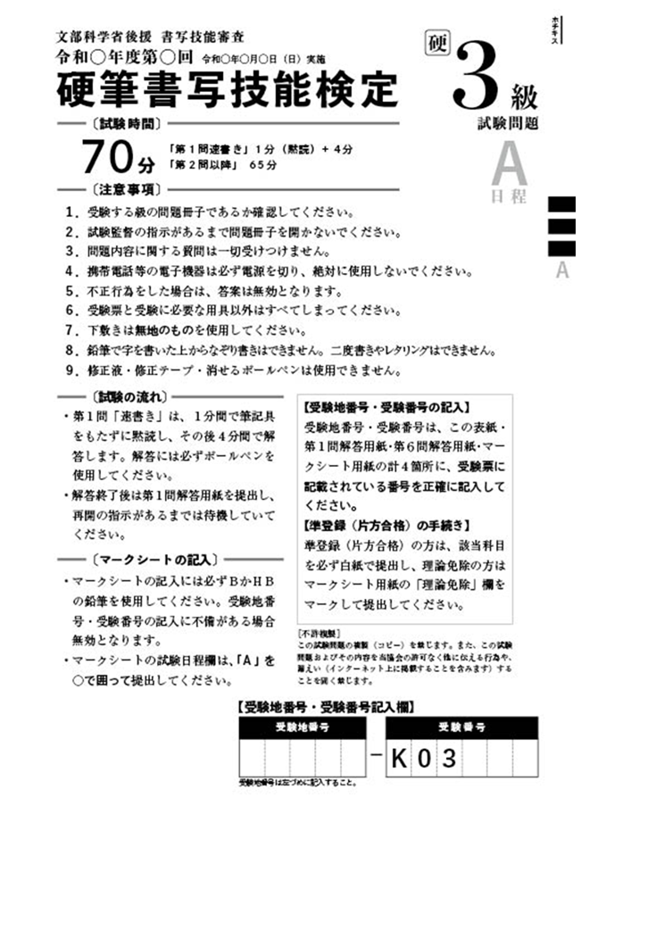 硬筆書写技能検定 3級過去問題 1回分