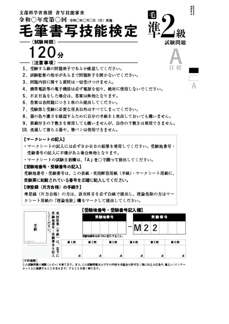 毛筆書写技能検定 準2級過去問題 1回分