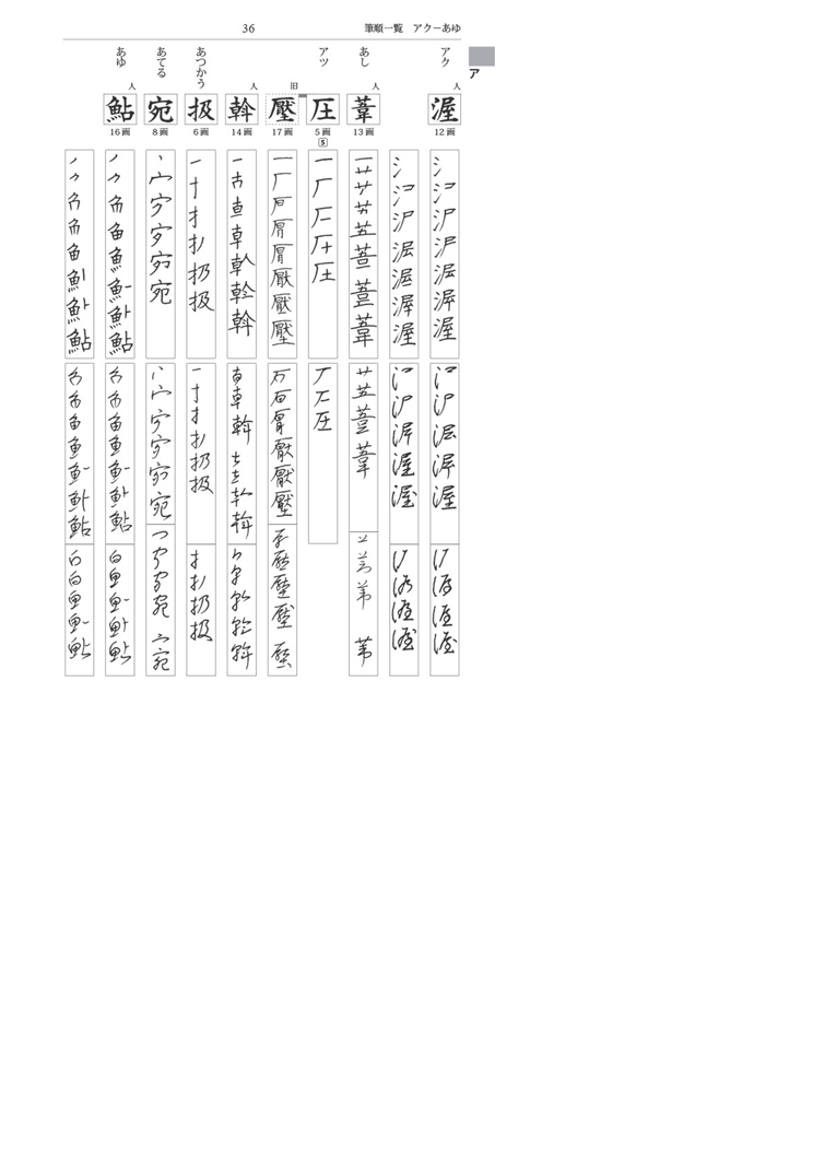 ・常用漢字2136字と人名用漢字や旧字体など822字,計2958字にペン字による楷・行・草の筆順を明示しています。