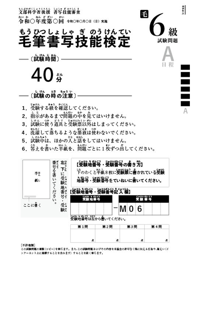 毛筆書写技能検定 6級過去問題 1回分