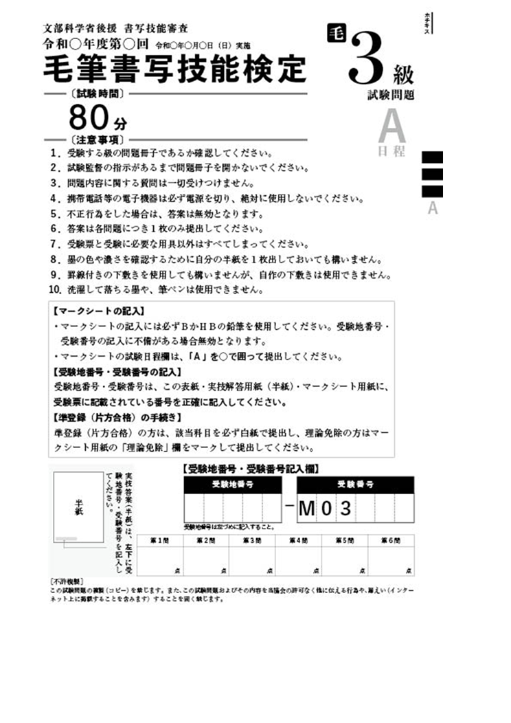 毛筆書写技能検定 3級過去問題 1回分