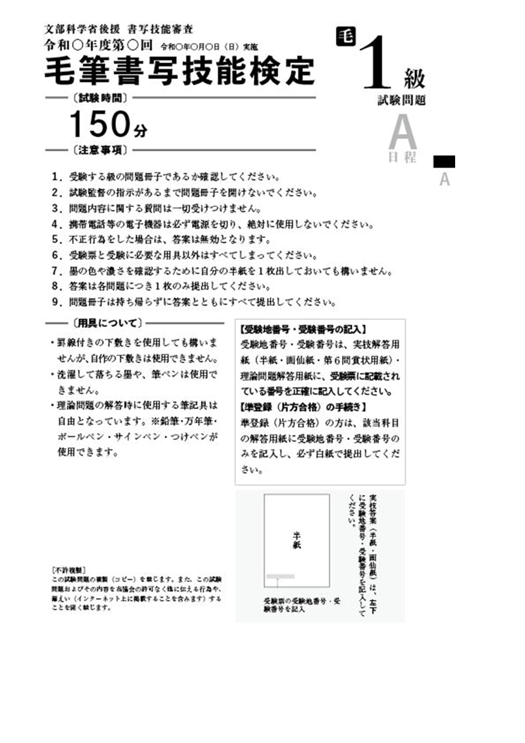 前回の毛筆書写技能検定1級実物の試験問題です。