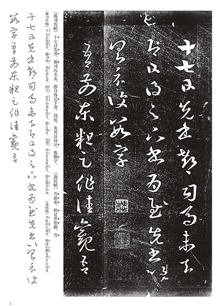 草書の基礎手本として第一に習われることが多い作品。拓本の系統がいくつかある中で、本書は日下部鳴鶴が「刻りが精到で実に生彩がある」と激賞した「三井本」を使用しています。点画の方向が変わっていく部分に「断筆」と呼ばれる部分があるのが特徴で、多くの大家に選ばれ、愛好されてきた名品です。