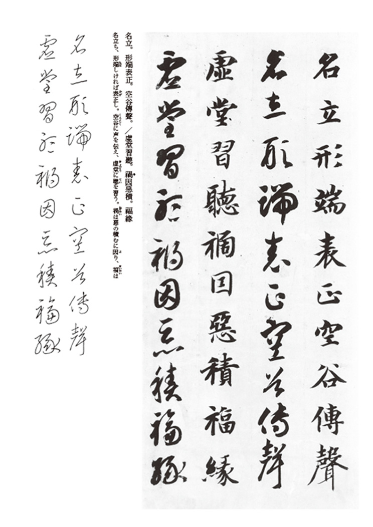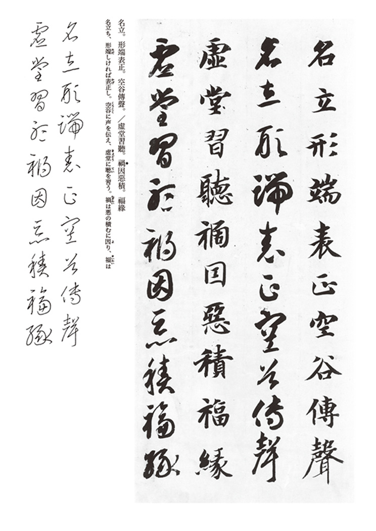 特に草書を学ぶ人にお勧めしたい名品。楷・草の両書体で書かれた千文字の四言古詩です。王羲之書法の流れを汲む南朝および隋の書法が感じられます。使用原本は唯一の肉筆本である『小川本』で、筆の抑揚のよく効いたたっぷりとした筆使いを堪能できます。 巻末の部首や部分一覧は、草書を覚えるのに便利です。